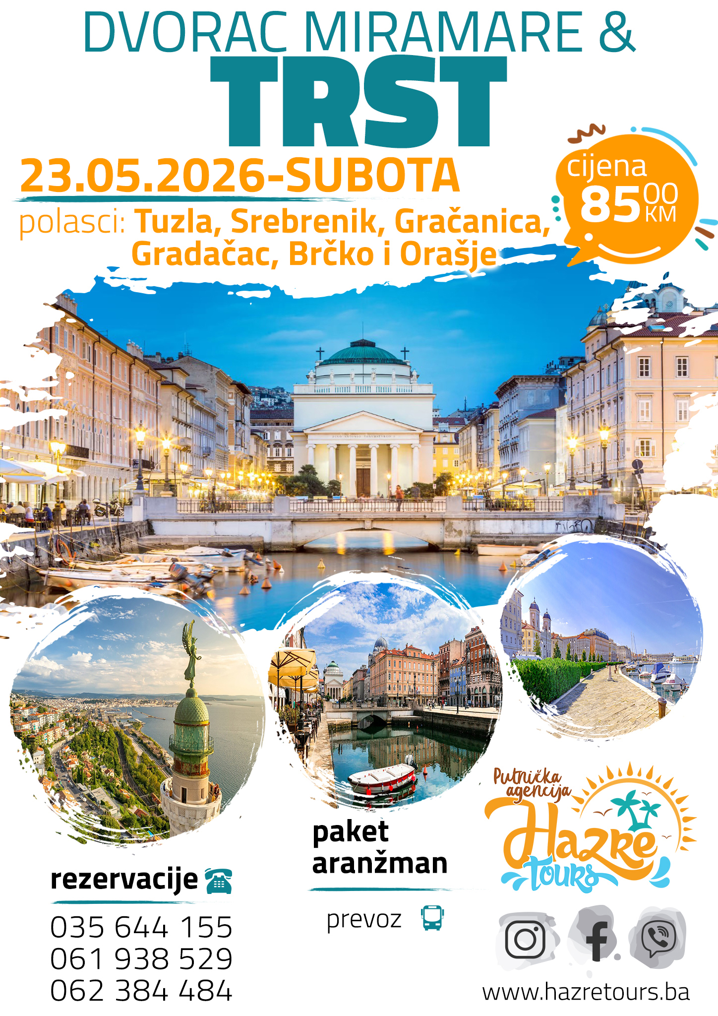 Po dolasku odlazak do dvorca Miramare, smještenog na obali Tršćanskog zaljeva, tik do mora. Dvorac je izgrađen 1856.g. i bio je ljubavno gnijezdo cara Maximiliana Habsburškog I njegove supruge, belgijske princeze Charlotte. Razgled dvorca i obilazak vrta i park šume koja ga okružuje uz doplatu ulaznice. Slijedi odlazak do Trsta, glavnoga grada talijanske regije Friuli-Venezia Giulia – fakultativni obilazak u pratnji turističkog vodiča, sa vodičem ćemo se uputiti prema centru Trsta. Prošetati ćemo Piazzom dell’Unita, najveći trgom u Trstu oblika slova “u”. Inače, predstavlja najveći europski trg smješten uz morsku obalu. Kroz šetnju u okolnim uličicama vidjeti ćete brojne poznate kavane. Najstarija je svakako Caffe Tommaseo (1830. godine). U blizini trga također smješteno je Verdijevo kazalište, uz koje se nalazi još jedna od mnogih poznatih kavana. Uz sve navedeno, vidjeti cete poznati Ponte Rosso te Canal Grande koji nalikom podsjeća na one u Veneciji. Slijedi slobodno vrijeme za šetnju, kafu, ručak. Polazak prema BiH u 16:30h. Vožnja preko Slovenij i Hrvatske do BiH. Dolazak u kasnim večernjim satima. Kraj programa.